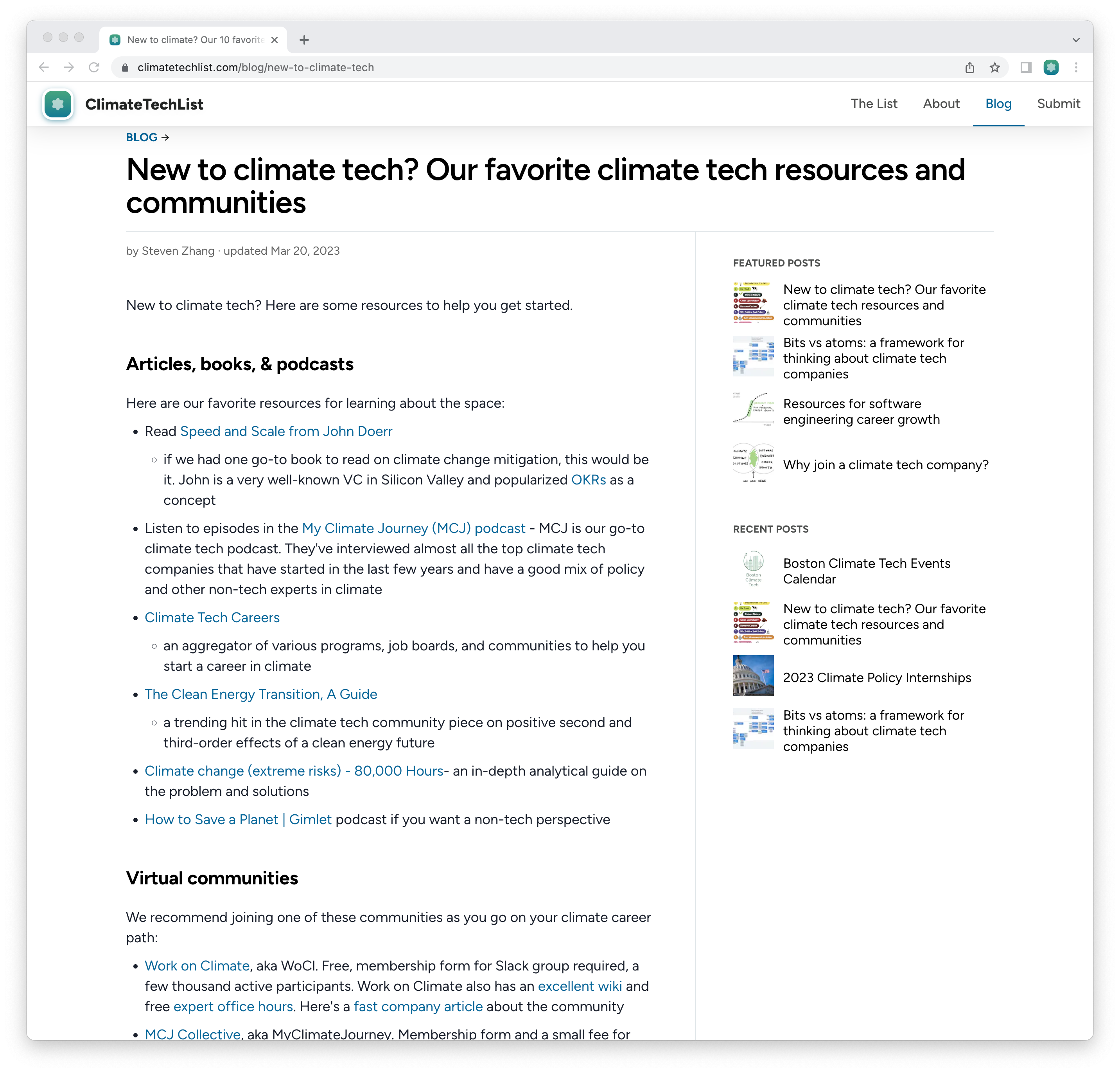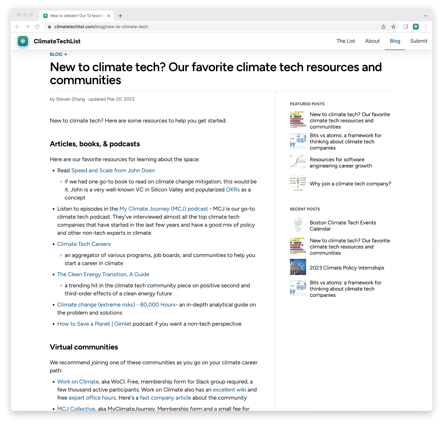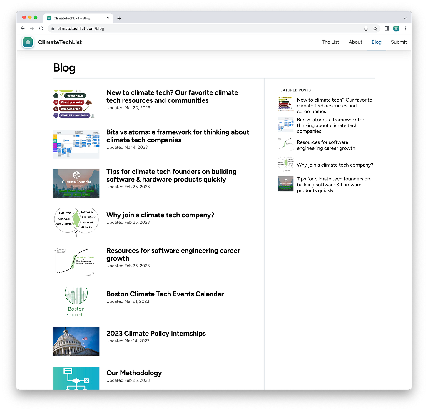 In addition, we have several blog post resources, such as this primer for those new to climate tech (the most popular blog post so far), this article about software engineering career growth, and this article about the bits vs atoms framework for thinking about climate tech sectors.